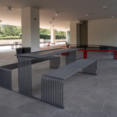 The product range is designed for outdoor areas however it does not disdain indoor spaces, such as shopping centres, large covered surfaces, lounges, airports, railway stations, bus stations.