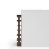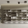 Modular wall shelves, 1600 mm wide. The shelves, with rounded corners, have trims on both ends that conceal the interior of the profile. It has wall hooks designed to be flexible in case of unevenness. The bases measure 250 mm. It is possible to integrate 400 mm and 800 mm sliding panels, in front or rear position. Combinable with the rest of the Wing shelvings. The maximum recommended height is seven shelves.