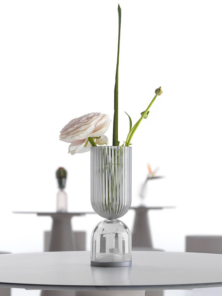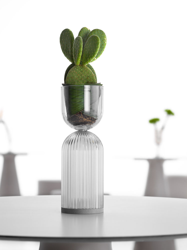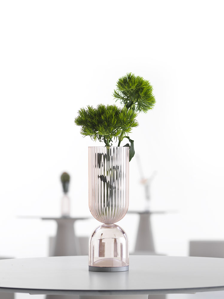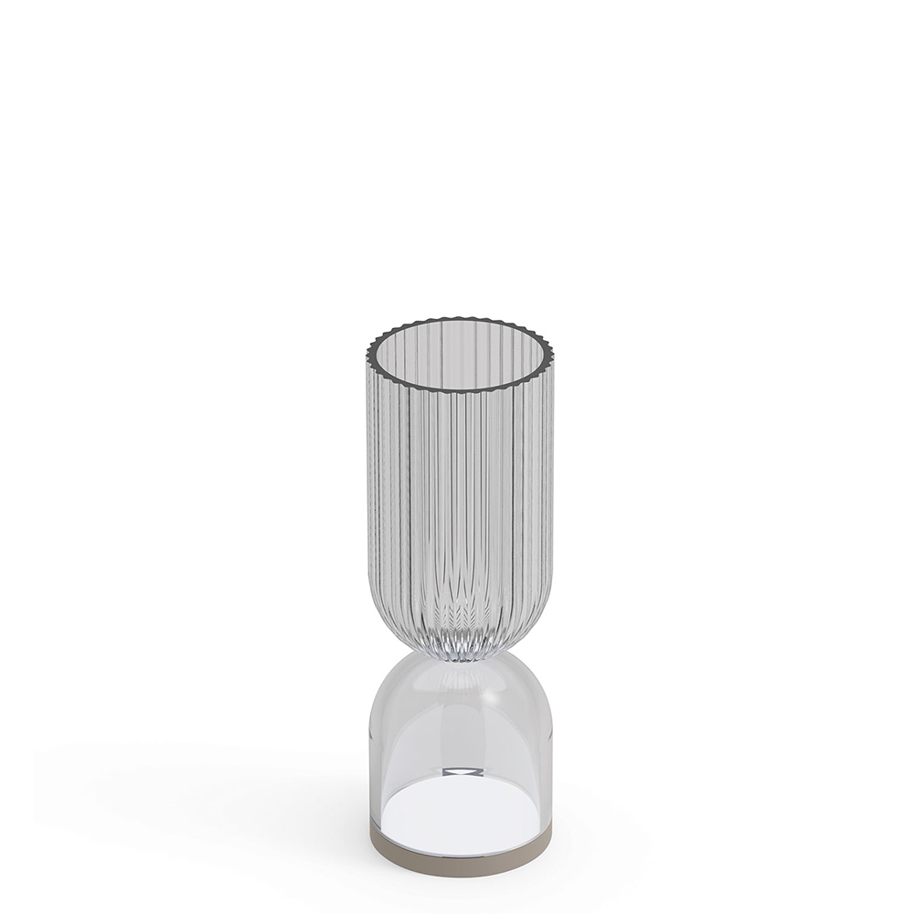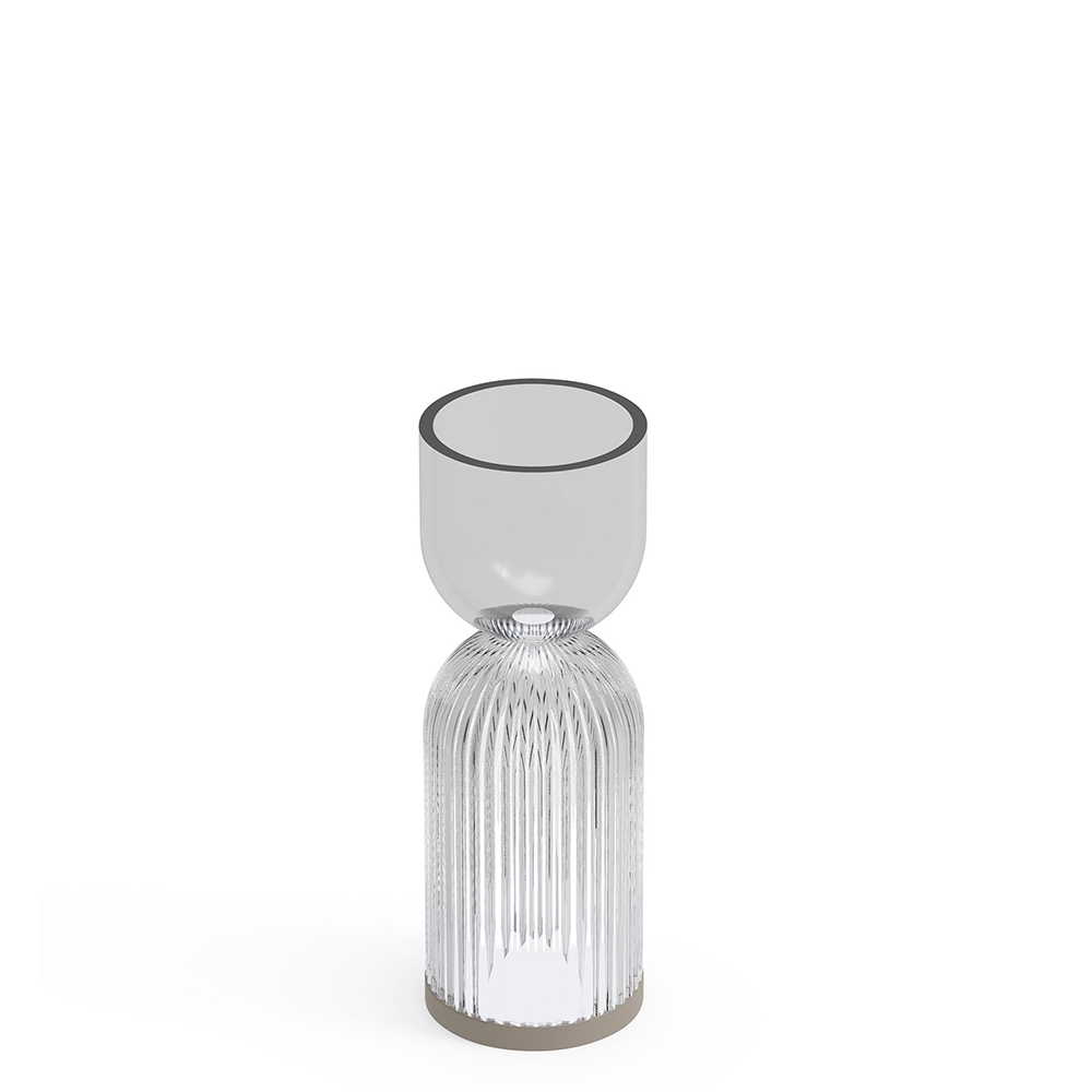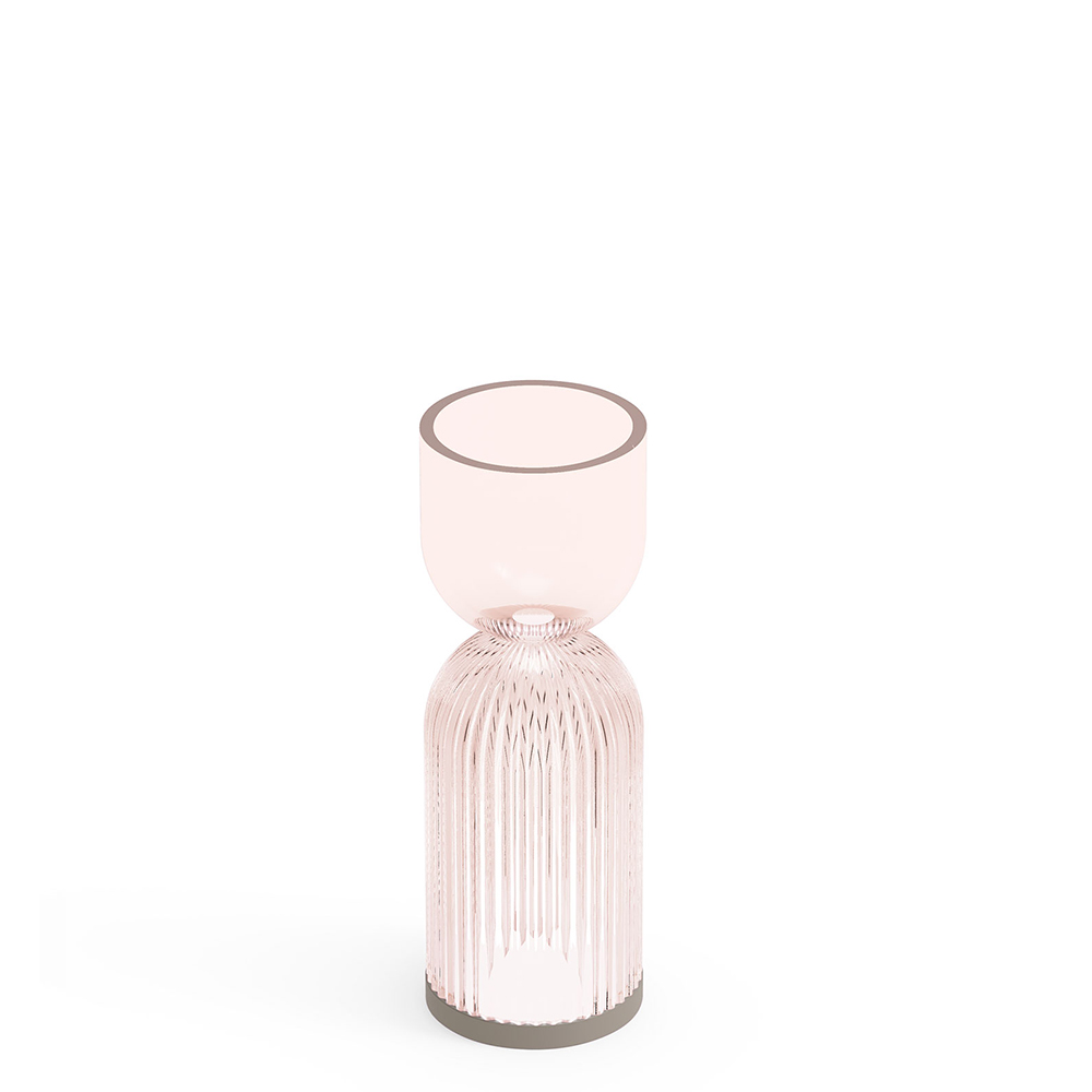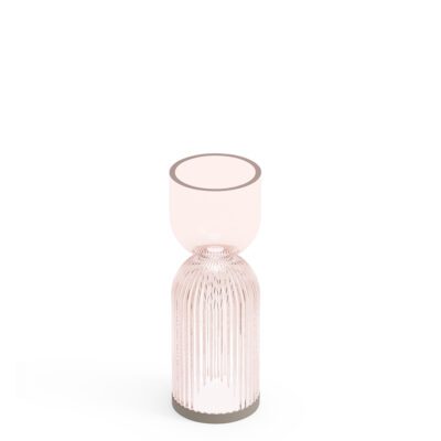 An asymmetrical, luminous hourglass: the perfect combination of a lamp and a compact vase, ideal for adding a touch of brightness and floral beauty to intimate spaces, from dusk until dawn. An elegant object made of injection-molded plastic and available in two captivating colors, it offers three different light intensities to adapt to different atmospheres and needs thanks to its refill.