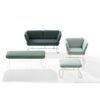 In the lounge chair version, the lower base alone, together with the cushion attached to it, becomes a comfy pouf that can also be occasionally used or as a seat or as footrest to complete this relaxing arrangement; whereas the small sofa becomes a comfortable and functional bench, by just keeping the lower frame with the cushion.