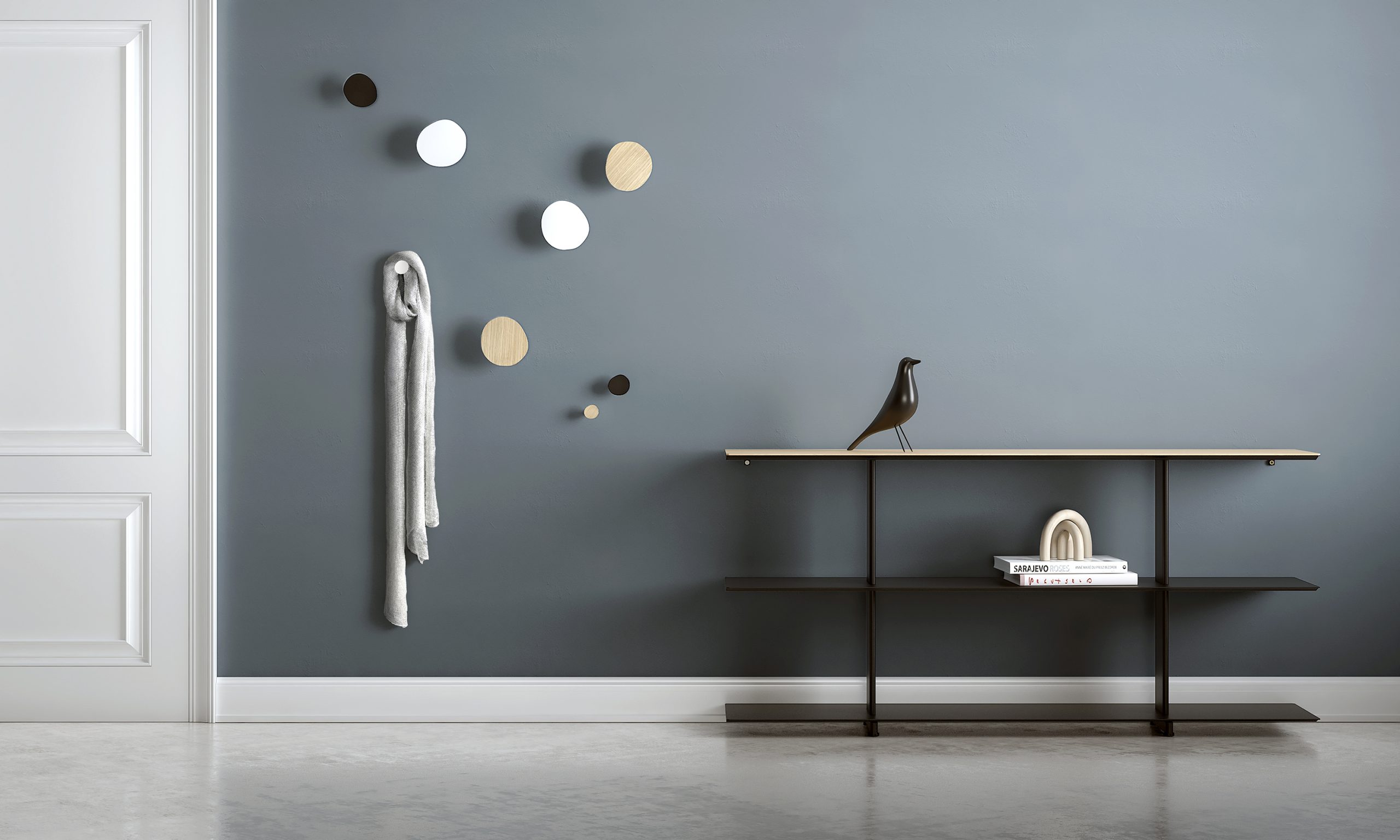 Cantha coat racks, made of aluminum, are suitable for any interior design trend due to their wide availability in 4 sizes, 11 colors and with the possibility of adding a natural oak veneer.