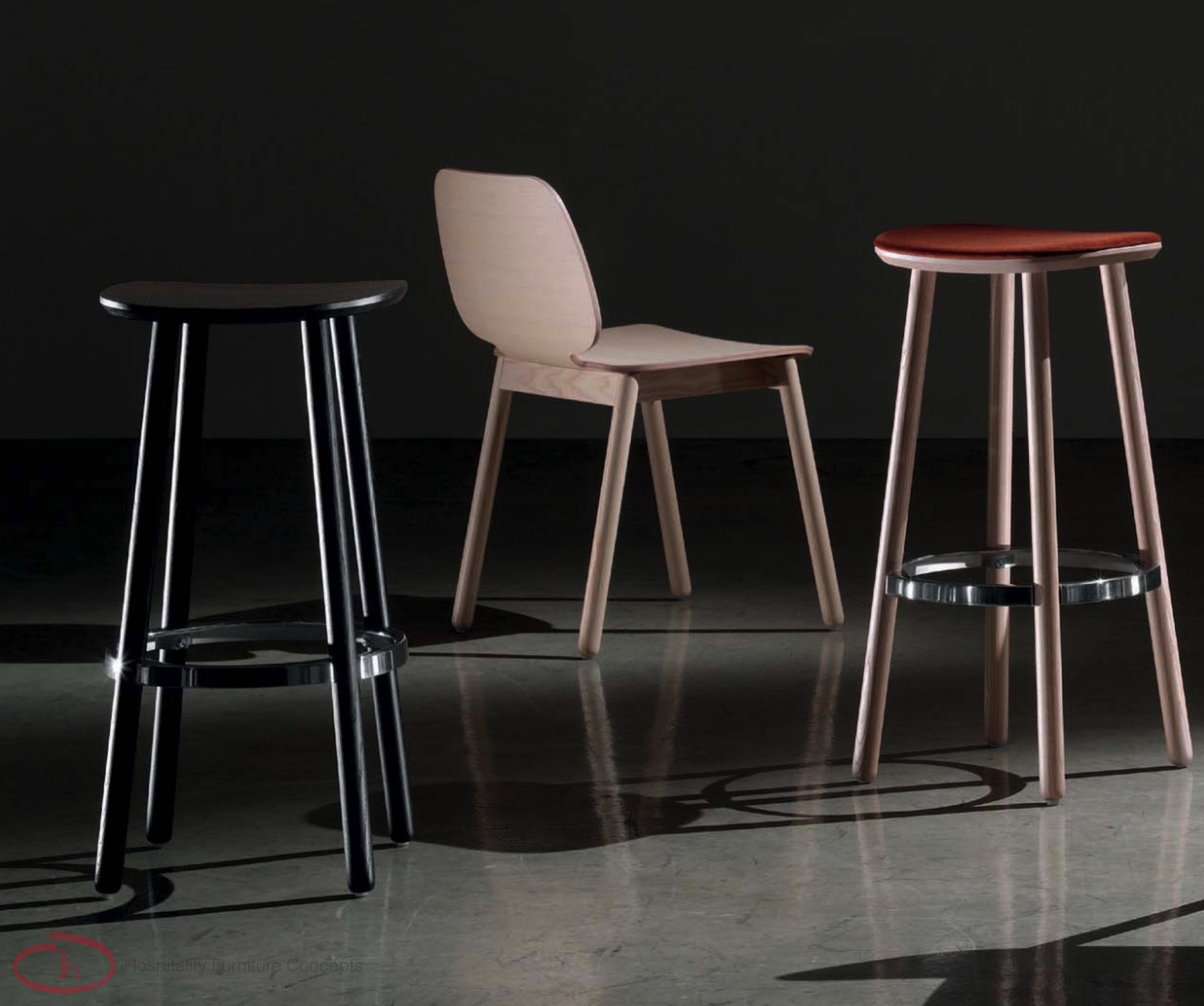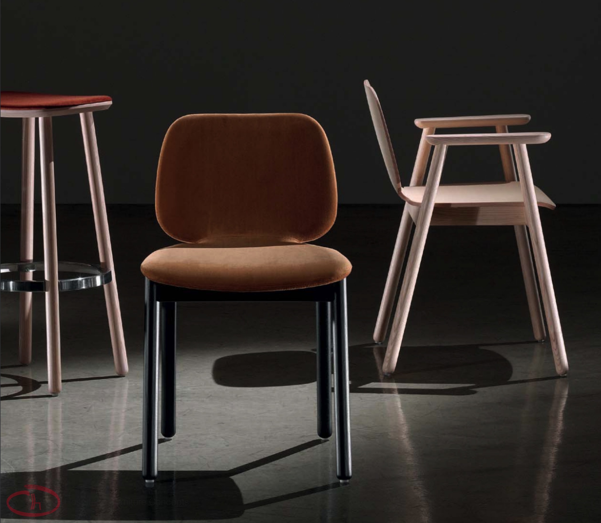 Simplicity turned into elegance. Scandinavian design. Chair, armchair and stool, all with a solid ash wood structure and multilayer shell, available also in the upholstered version.