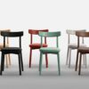 Solid ash chair painted in wood colors, or in ash gray, lichen green and rust open-pore lacquered. The flat seat in solid ash can be completed with a fixed upholstered pad in the fabrics or ecoleather proposed by Arrmet or with the customer’s upholstery.