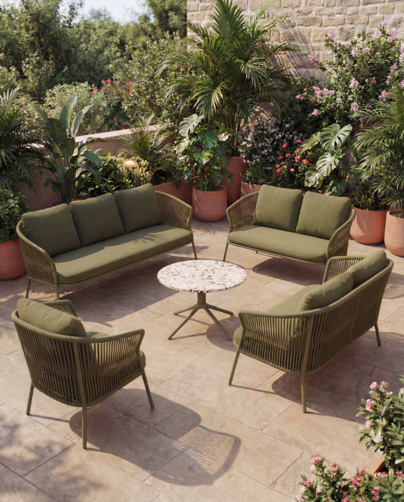Rope-woven outdoor furniture adds warmth and texture while staying practical for commercial environments. It suits outdoor dining and lounge zones where you want comfort without heavy visual mass.