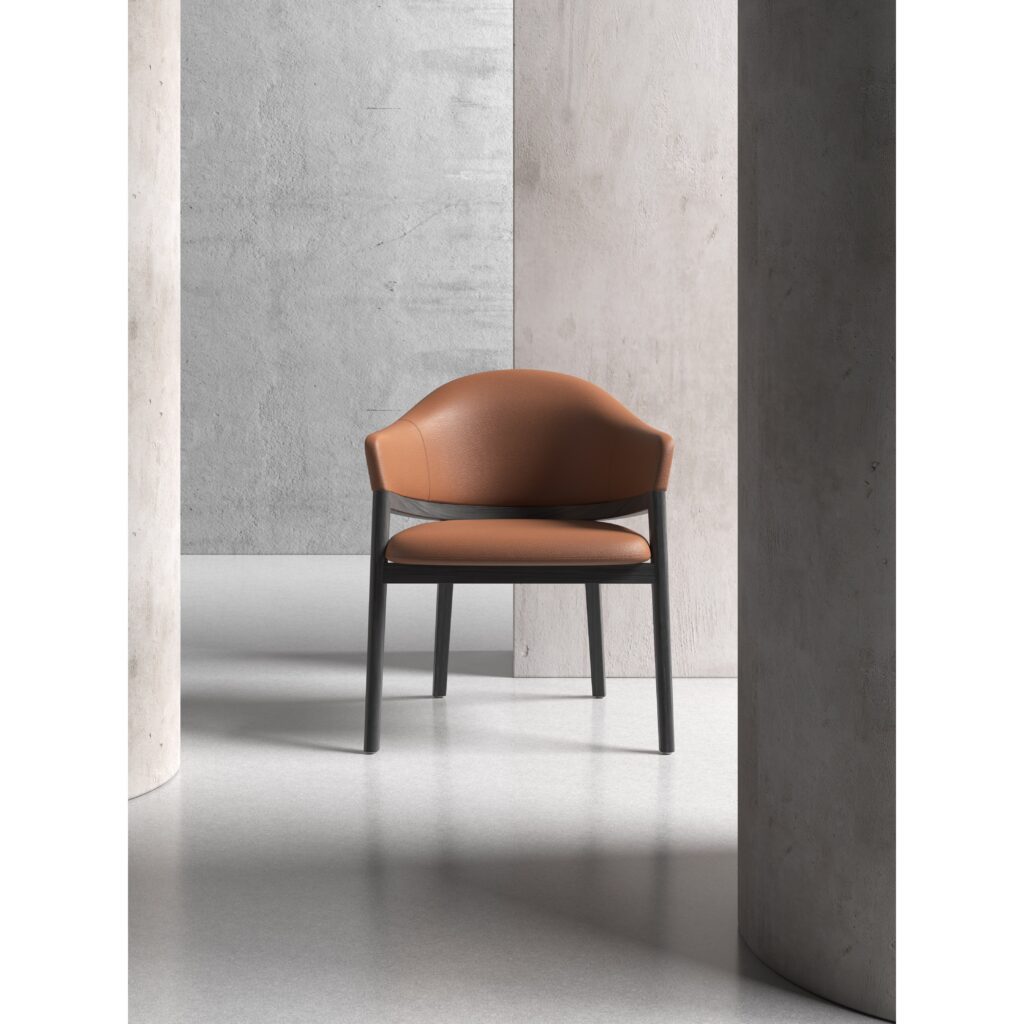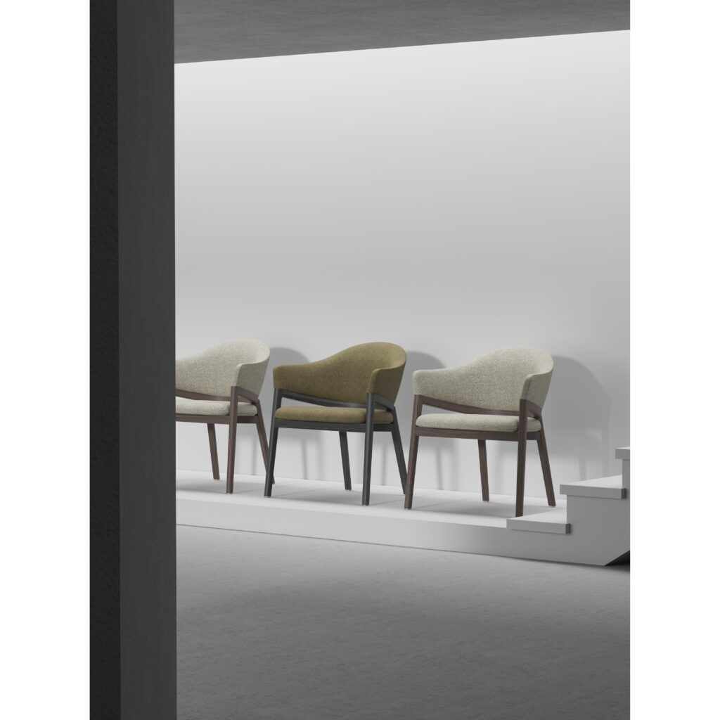 The structure pairs a solid ash wood frame with a curved timber backrest, expressing warmth through material and precision through form. The upholstered seat enhances comfort while allowing flexibility across fabric and leather finishes.