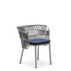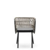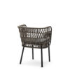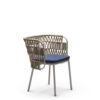 Powder coated steel frame for outdoor use anthracite or sand. Upholstered cushion with fabric for outdoor use. Back woven by hand with marine rope.
