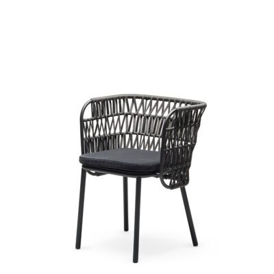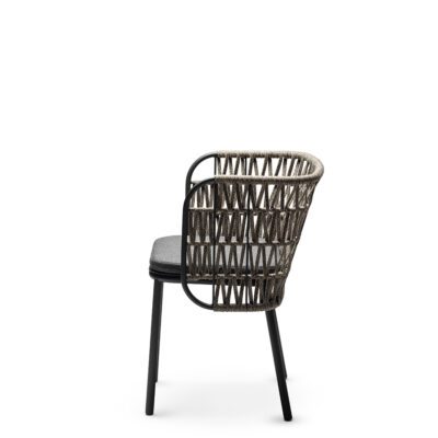 Powder coated steel frame for outdoor use anthracite or sand. Upholstered cushion with fabric for outdoor use. Back woven by hand with marine rope.