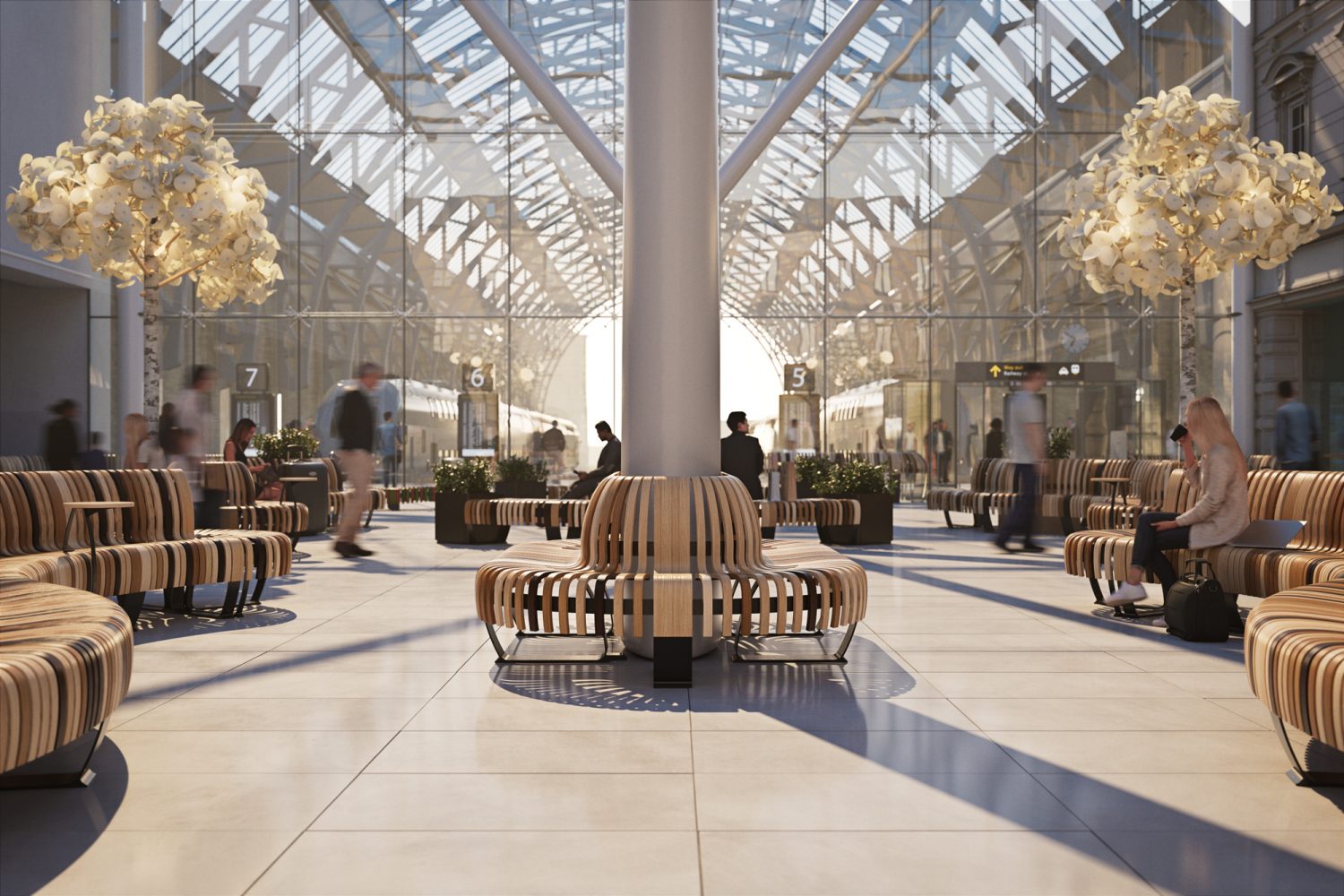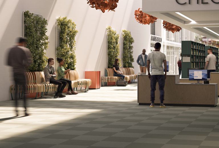 Green designs for high-traffic environments where flow, dwell time and durability matter — from terminals and stations to education and healthcare public zones.