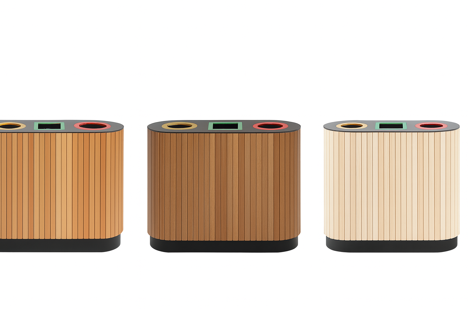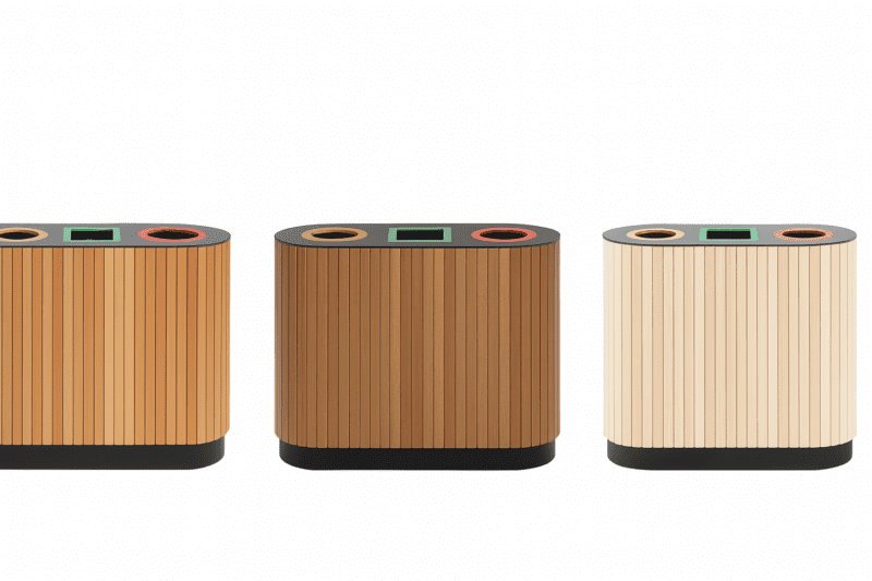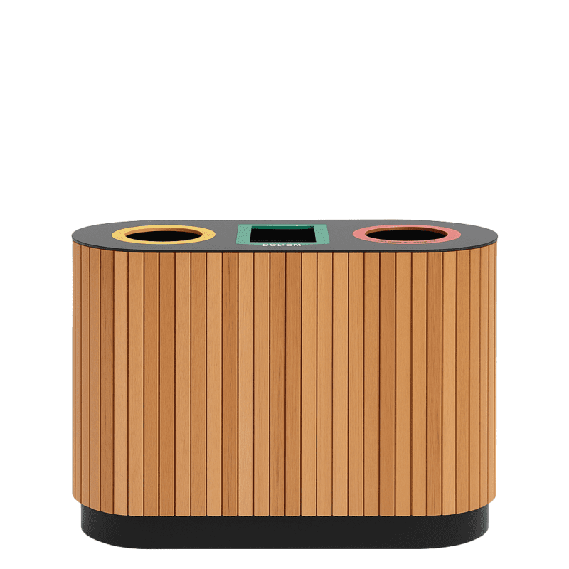 The Linea Triple Bin 3410 is a triple waste and recycling unit designed for high-use environments. Its soft radius form and vertical timber slats create a refined presence suited to plazas, terminals, food courts, and urban streetscapes.