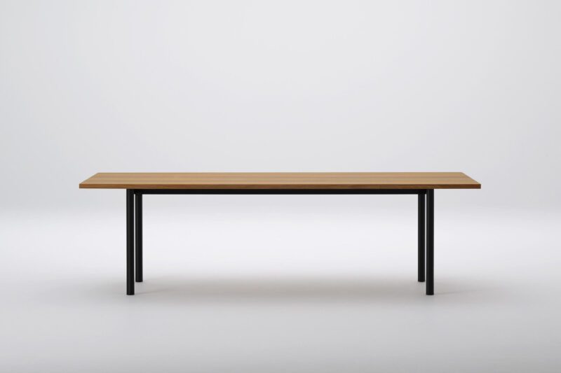 We received many requests for a large-sized table with a pure solid tabletop. Being over three meters in length, the tabletop required steel beams so that it would not become warped. In addition to the black beams, the table has steel legs with a diameter of 48.6 mm.