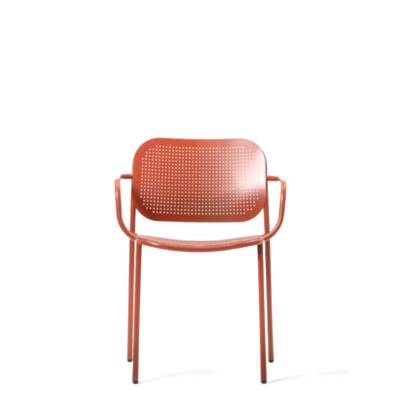 The collection includes the chair with or without armrests, the lounge version with or without armrest and the stool in two heights. In all versions, the tubular metal frame is complementedby curved, sheet metal backrests and seats with a decorative hole pattern that is a modern interpretation of the classic Viennese weave. Available in all standard and special colours, Metis Dot bringsits unique style to indoor and outdoor spaces.