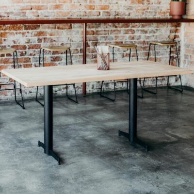 The Norock Parkway twin base self-stabilising table base captures an industrial rawness. Angular and architectural, the exposed componentry and minimalist design illustrates the elements – crafted, zinc-plated steel, exposed fasteners and a dichotomous simplicity.