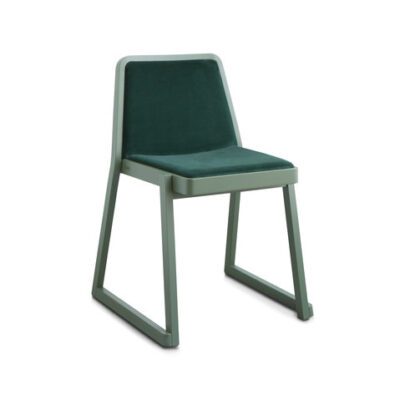 The frame, seat and backrest are in beech, either bleached, natural or lacquered in a very wide range of shades. The seat and backrest are padded and upholstered in fabric, velvet, leather, faux leather, or flame retardant Trevira textiles.