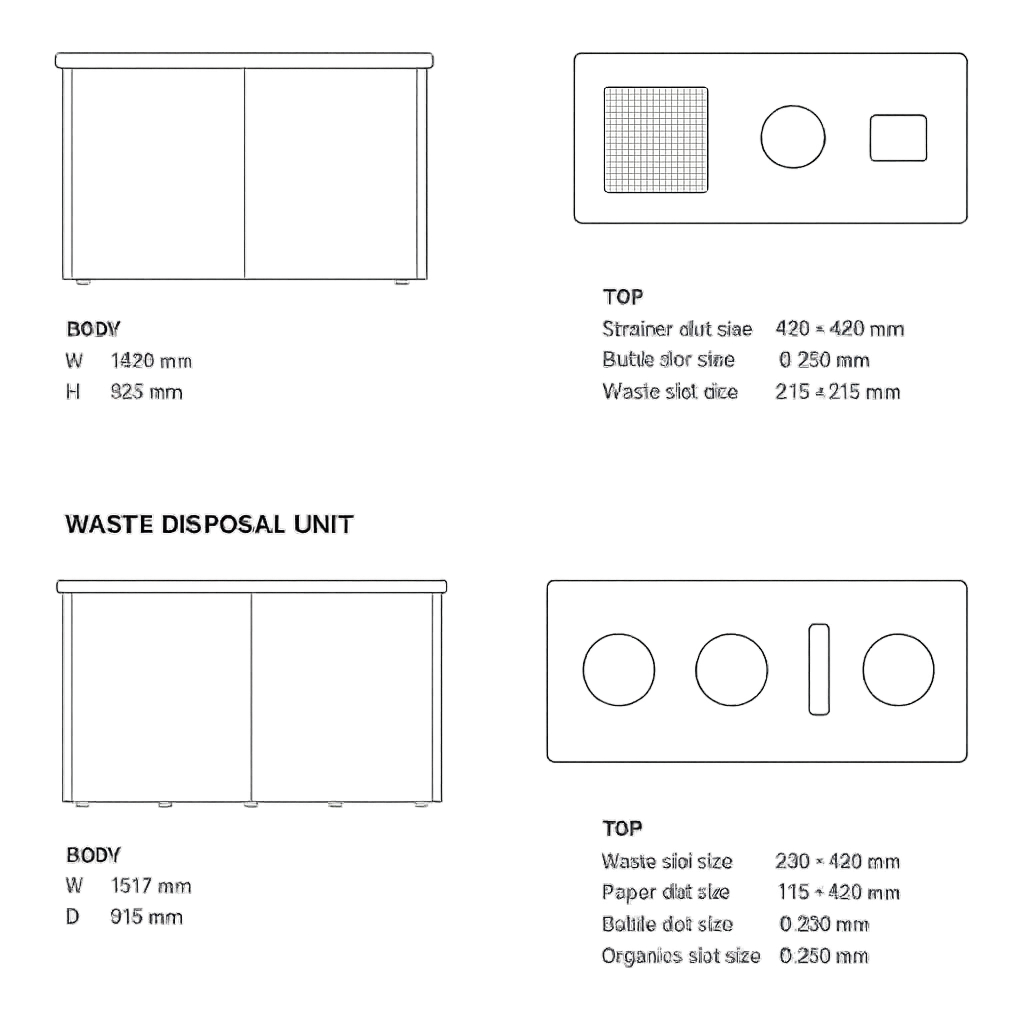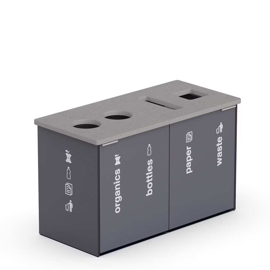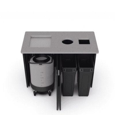 Each unit is built from durable phenolic panels with a Silestone top, providing long-term resistance to wear in public environments. The tank sits on a dolly with lockable castors for effortless drainage, and standard bold graphic decalsimprove user visibility and wayfinding.