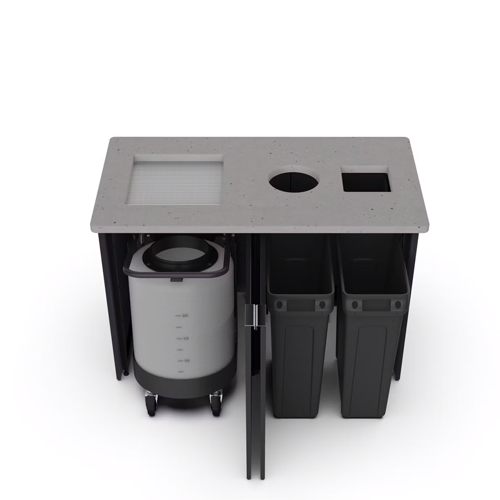 It features an advanced stainless steel strainer and 20-gallon antimicrobial tank, designed to collect and store liquids safely. Separate chutes for bottles and general waste ensure streamlined sorting, while removable PE liners and a welded steel frame make cleaning and maintenance easy.