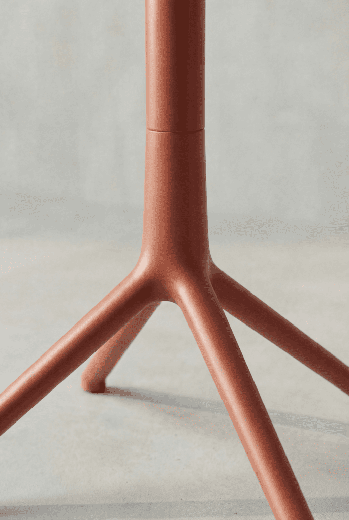 Its central column transitions seamlessly into four splayed legs, creating a lightweight yet rigid structure engineered for stability across a wide range of tabletops.
