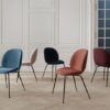 The Beetle Chair Collection is a chair series in laminated moulded veneer with seat and back in 2 separate parts. The 2 parts are joined together with a steel fitting milled into the 2 shells. The chair is always fully upholstered in fabric or leather.