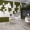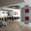 Gaber acoustic products ensure significantly improved acoustics in private homes as well as in offices, hotels and public spaces; decorating modern buildings and already existing installations, quickly and easily removing reverberation without structural modifications. The Stilly sound-absorbing system allow, by combining the Flat and Pyramid versions, countless configurations, thereby adding a classy look to the surroundings. In this way, the sound-absorbing panels constitute contemporary design in themselves. The goal is to help create a sustainable sound environment for more efficient work output and better breakout areas.