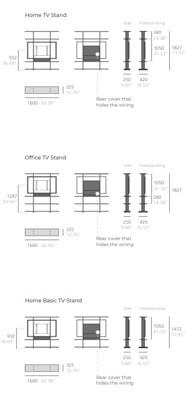 1600 mm wide TV stand designed for individual use or to form compositions with the Wing shelves. Includes a rear panel that hides the connections. Supports screens up to 70 inches, with a maximum width of 1600 mm. VESA 100, 200, 300, 400 and 600 mounting interface standard. Both in its home and office versions, this product can be wall-mounted or freestanding. Includes a rear cover that hides the connections.